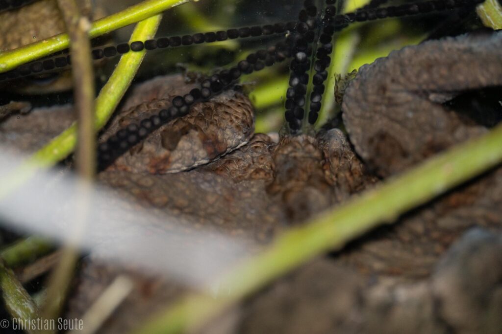 Der Laich von Erdkröten unterscheidet sich von Fröschen durch ihre Anordnung. Frösche legen ihre Eier in Ballenform, wohingegen Erdkröten Laichschnüre ablegen. Die Laichschnüre sind ein eindeutiges Indiz für die Anwesenheit von Kröten im Gewässer.